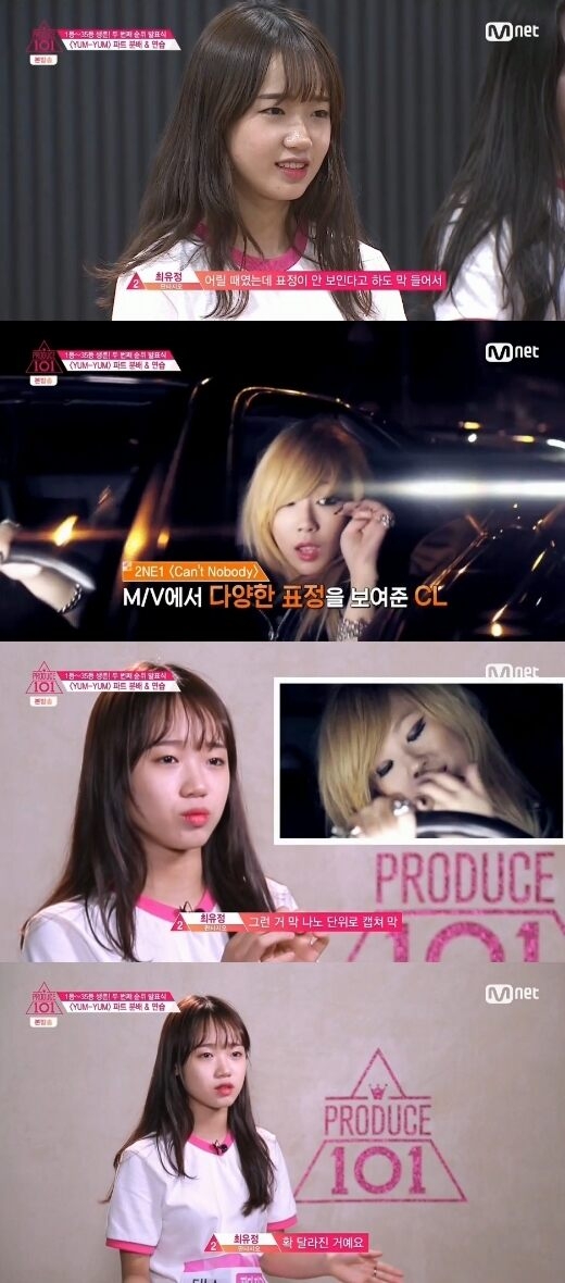 11일 밤 방송된 케이블채널 엠넷 ‘프로듀스101’에서 판타지오 최유정은 “어릴 때였는데 표정이 안 보인다고 하도 들어서 스트레스를 너무 많이 받았다”고 말했다.