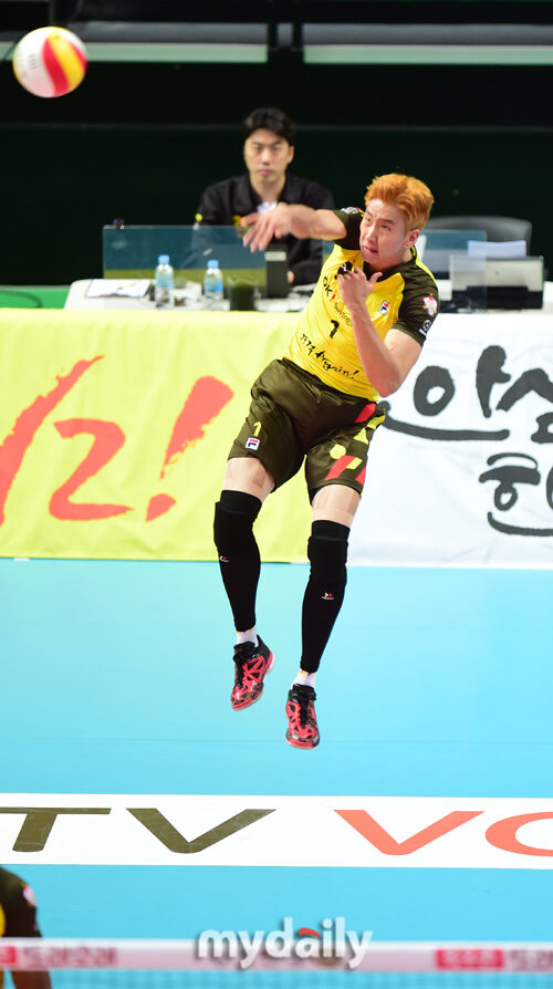 [마이데일리 = 안산 곽경훈 기자] OK저축은행 송명근이 2일 오후 경기도 안산시 상록수체육관에서 진행된 '2015-2016 NH농협 V-리그' 남자부 플레이오프 1차전 OK저축은행-삼성화재 경기에서 서브를 넣고 있다.
