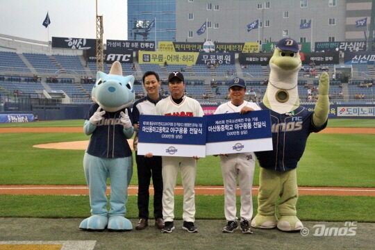 NC는 이날 경기에 앞서 마산용마고등학교 김성훈 감독과 마산동중학교 김재율 감독을 초청, 축하 인사를 전했다. 또 야구용품 전달식을 진행해 두 학교에 야구용품 지원을 약속했다.