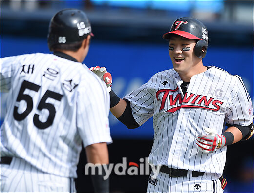 [마이데일리 = 송일섭 기자] LG 양석환이 18일 오후 서울 잠실야구장에서 열린 '2016 프로야구 KBO리그' LG 트윈스 vs 삼성 라이온즈의 경기 2회말 1사 1,2루서 3점홈런을 터뜨린 뒤 홈을 밟고 있다.