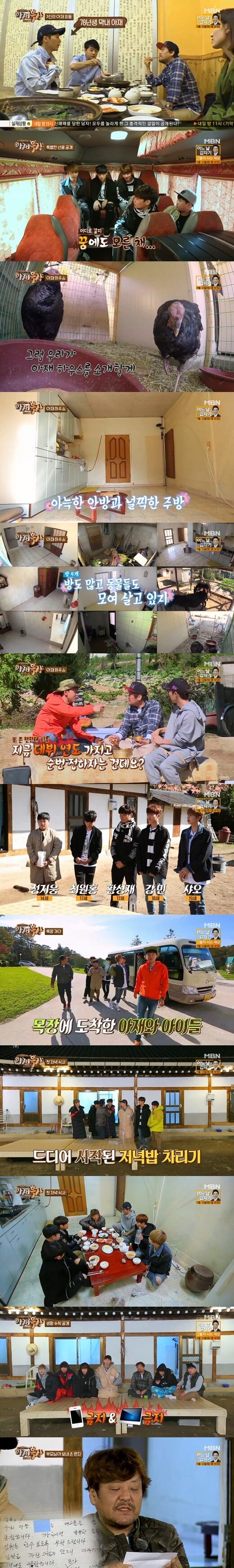 9일 밤 첫 방송된 종합편성채널 MBN 새 예능프로그램 '양치는 늑대소년들의 아재목장'(이하 '아재목장')에서는 힐링을 찾아 강원 평창에 온 아재 3인방 배우 성지루, 김승수, 가수 장우혁과 다섯 소년들의 첫 만남이 그려졌다.