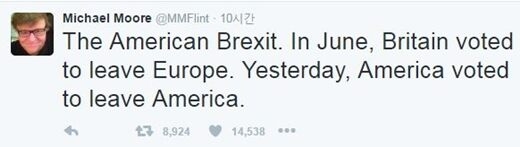 마이클 무어는 트럼프가 당선되자 트위터에 “영국은 유럽 탈퇴에 투표했고, 미국은 미국 탈퇴에 투표했다”고 지적했다.