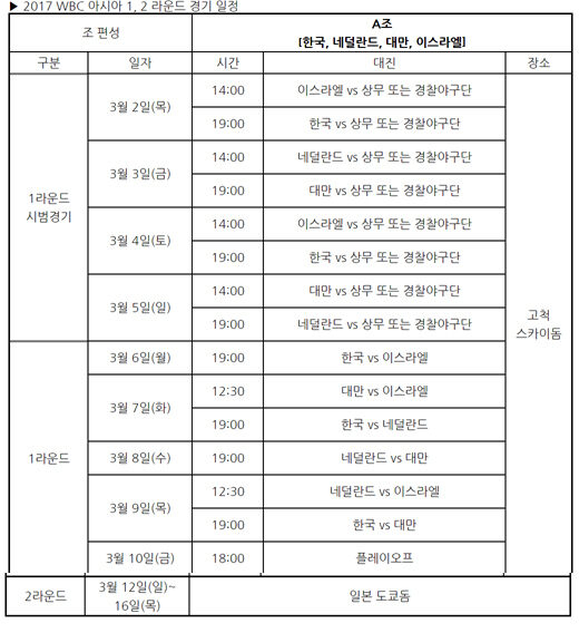 [마이데일리 = 고동현 기자] KBO는 내년 3월 서울 고척스카이돔에서 개최되는 2017 월드베이스볼클래식(WBC) 1라운드 A조(한국, 네덜란드, 대만, 이스라엘)의 경기 일정이 최종 확정됐다고 10일 밝혔다.