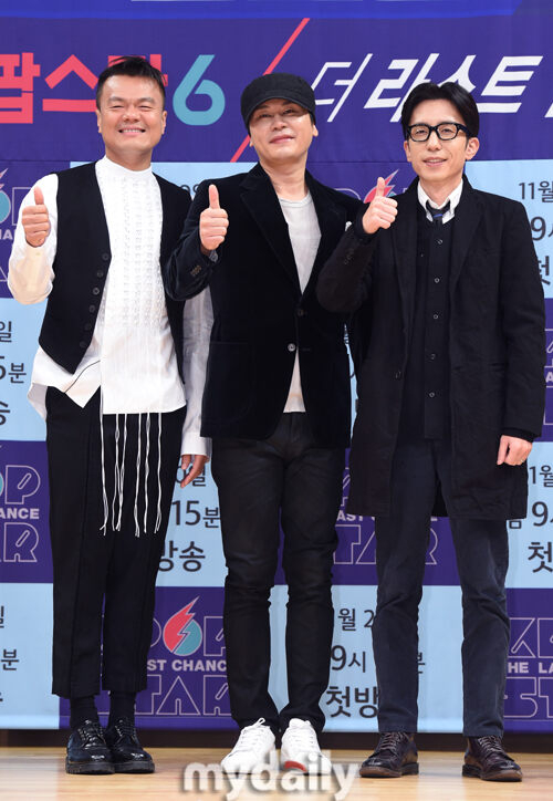 [마이데일리 = 곽경훈 기자] 박진영,양현석,유희열(왼쪽부터)이 10일 오후 서울 목동 SBS에서 진행된 K팝스타6 제작발표회에서 다정하게 포즈를 취하고 있다.