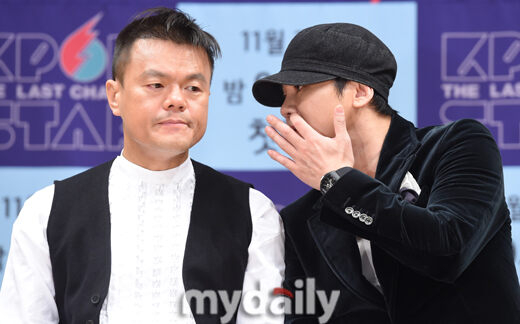 [마이데일리 = 곽경훈 기자] 박진영(왼쪽)과 양현석이 10일 오후 서울 목동 SBS에서 진행된 K팝스타6 제작발표회에서 이야기를 나누고 있다.