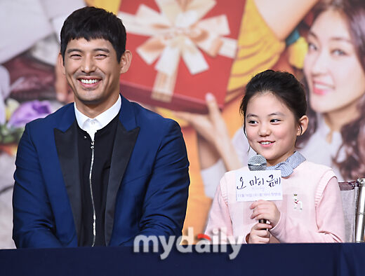 [마이데일리 = 한혁승 기자] 배우 오지호(왼쪽)가 10일 오후 서울 영등포 타임스퀘어 아모리스홀에서 진행된 KBS 2TV 수목드라마 '오 마이 금비' 제작발표회에 참석해 아역 허정은이 답변을 하자 미소를 짓고 있다.