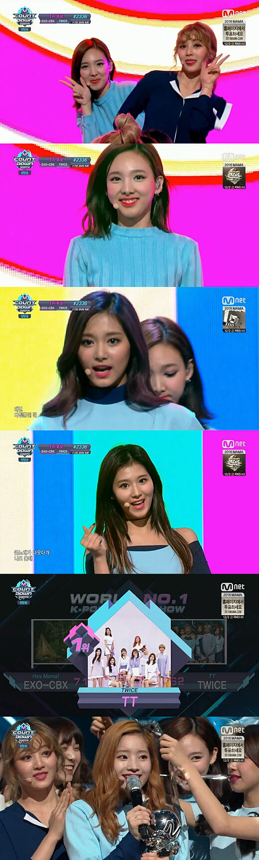 트와이스는 10일 오후 방송된 케이블채널 엠넷 '엠카운트다운' 500회 특집에서 노래 'TT'로 보이그룹 EXO-CBX(첸백시)의 '헤이 마마'를 제치고 1위를 차지했다.