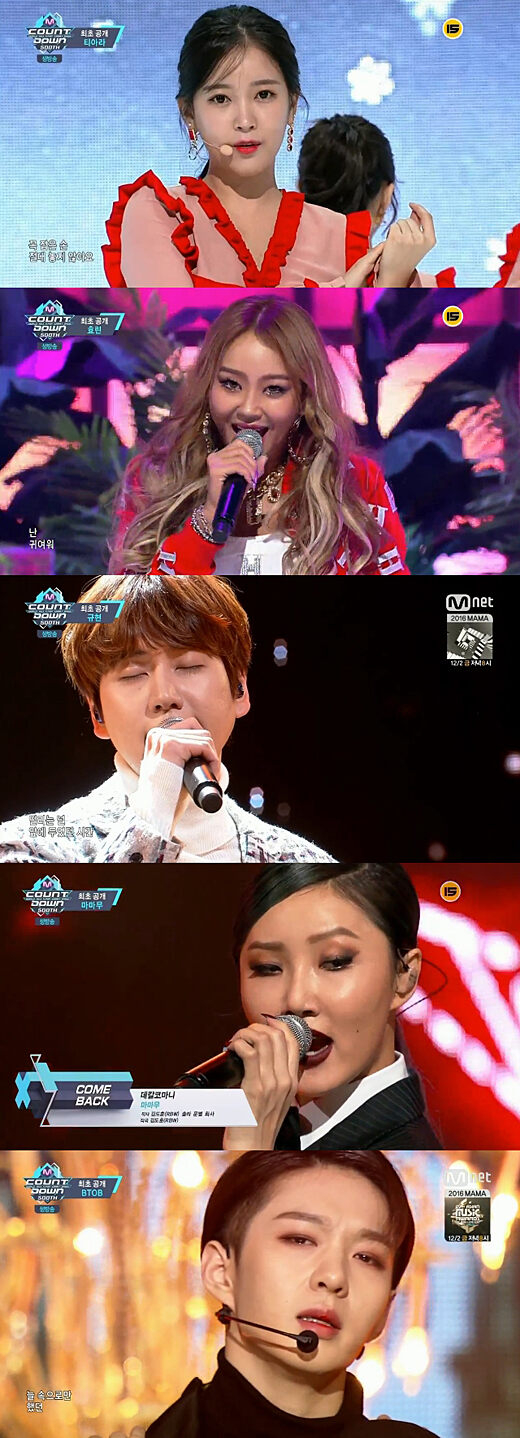 티아라가 컴백해 새 앨범 타이틀곡 '티아모'와 발라드 수록곡 '오늘까지만 아파할 거야'를 최초 공개했다. 씨스타 효린은 '파라다이스'와 '원 스텝' 솔로 컴백 무대를 공개했으며, 규현은 신곡 '블라블라'로 컴백했다. 마마무는 '데칼코마니' 무대를 방송에 첫 공개했고, 비투비는 '기도'와 '뉴맨'으로 컴백을 알렸다.