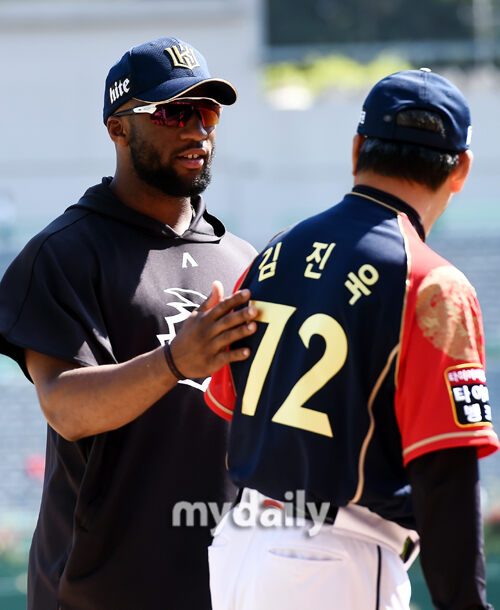 [마이데일리 = 인천 곽경훈 기자] kt 로하스가 3일 오후 인천 SK행복드림구장에서 진행되는 '2018 신한은행 MY CAR KBO리그' SK-kt의 경기전 김진욱 감독와 이야기를 나누고 있다.