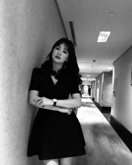 송혜교는 3일 오후 인스타그램에 "2018.6.1"이라고 적고 흑백 사진 한 장을 게재했다. 블랙 미니 원피스를 차려 입은 그는 우아한 분위기를 자아내며 카메라를 향해 포즈를 취하고 있다.