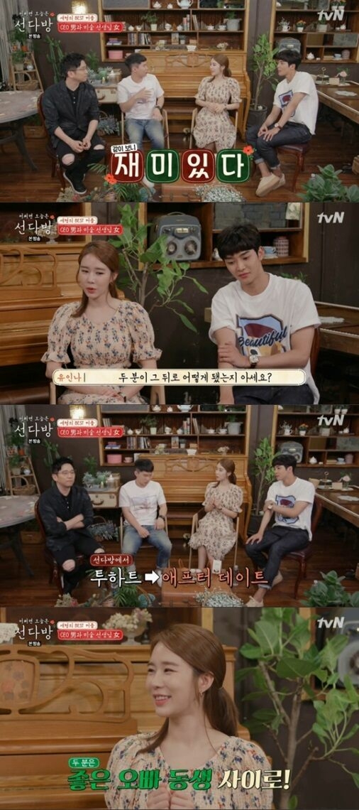 양세형은 1회에 나왔던 CEO, 미술 선생님 맞선남녀를 기억했다. 유인나는 뒷이야기를 안다며 "투하트 이후 애프터 데이트를 하셨다. 그러고 좋은 오빠 동생 사이가 됐다더라"고 밝히며 "연인으로 발전한다는 건 어려운 일이다"고 말했다.