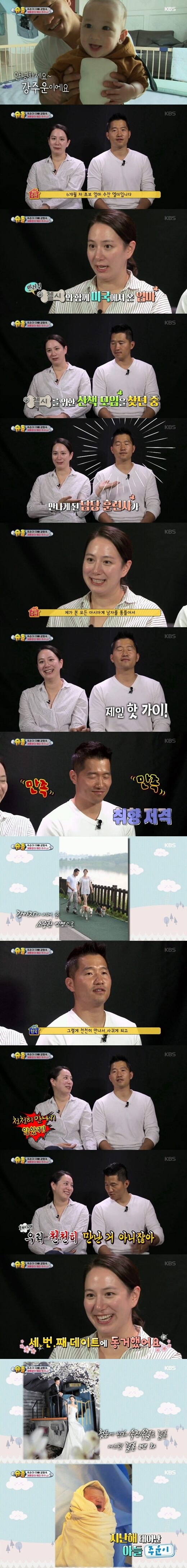 이날 강형욱은 "6개월 차 초보 아빠 강형욱이다"며 자신을 소개했다. 이어 아내 수잔도 "나는 수잔 엘더라고 한다"며 "우리 집에서 키우는 첼시는 내가 미국에서부터 키운 강아지다. 한국에 왔을 때 첼시를 위한 산책모임을 찾다가 담당 훈련사인 강형욱을 처음 만났다"고 기억을 떠올렸다.