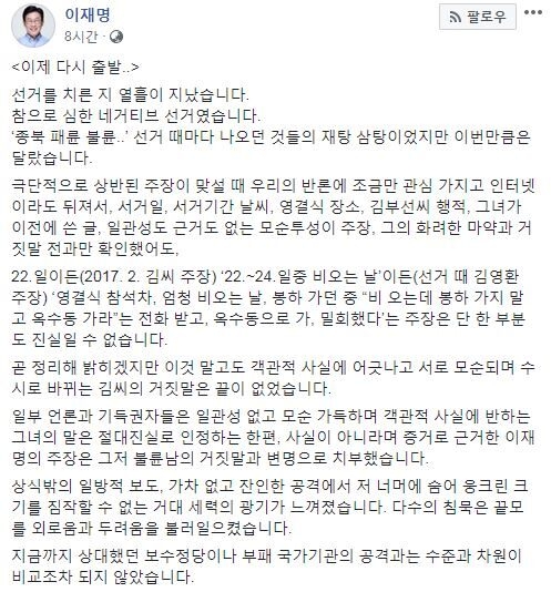 이 당선인은 “곧 정리해 밝히겠지만 이것 말고도 객관적 사실에 어긋나고 서로 모순되며 수시로 바뀌는 김씨의 거짓말은 끝이 없었다”면서 “일부 언론과 기득권자들은 일관성 없고 모순 가득하며 객관적 사실에 반하는 그녀의 말은 절대진실로 인정하는 한편, 사실이 아니라며 증거로 근거한 이재명의 주장은 그저 불륜남의 거짓말과 변명으로 치부했다”고 지적했다.