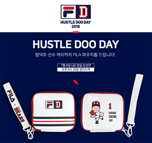 이번 '휠라 허슬두데이' 주인공은 함덕주다. 두산은 이날 레드석 102, 202 블럭을 ‘허슬두데이A존’, 레드석 101, 201 블럭을 '허슬두데이 B존'으로 편성해 이 좌석을 예매한 팬들에게 함덕주 캐리커처 FILA 파우치를 선물한다.