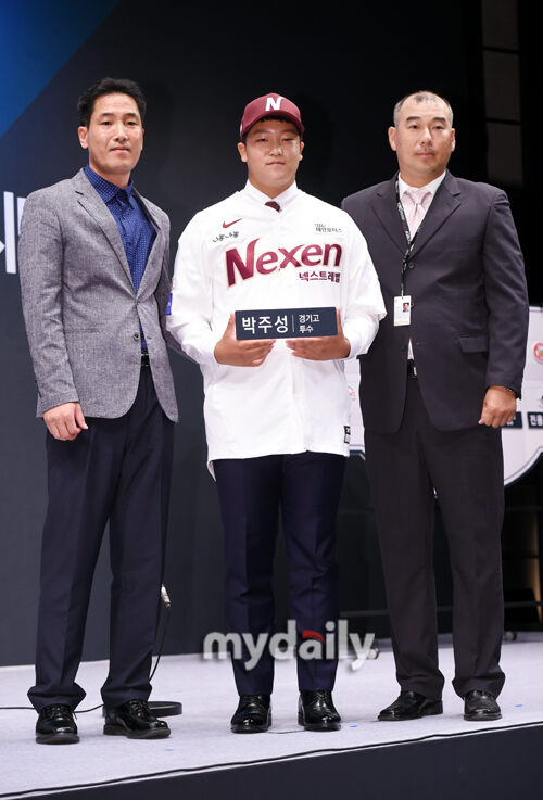 [마이데일리 = 곽경훈 기자] 경기고 박주성이 25일 오후 서울 소공동 웨스턴조선호텔에서 진행된 '2019 KBO 신인 1차 지명 행사'에서 넥센 1차 지명을 받은뒤 구단 관계자들과 기념촬영을 하고 있다.