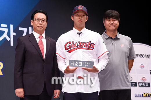 [마이데일리 = 곽경훈 기자] 경남고 서준원이 25일 오후 서울 소공동 웨스턴조선호텔에서 진행된 '2019 KBO 신인 1차 지명 행사'에서 롯데 1차 지명을 받은뒤 구단 관계자와 포즈를 취하고 있다.