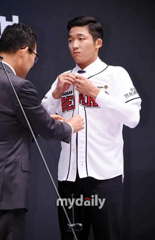 [마이데일리 = 곽경훈 기자] 휘문고 김대한이 25일 오후 서울 소공동 웨스틴 조선호텔에서 진행된 '2019 KBO 신인 1차 지명 행사'에서 두산 1차 지명을 받은뒤 유니폼을 입고 있다.