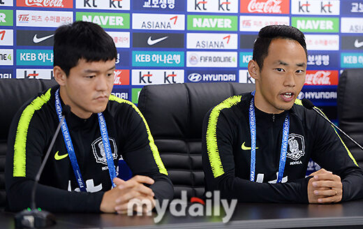 [마이데일리 = 상트페테르부르크(러시아) 김성진 기자] 대한민국 축구대표팀 주세종과 문선민이 25일 오후(현지시간) 러시아 상트페테르부르크 로모노소프 스파르타크 경기장에서 진행된 기자회견에 참석해 취재진의 질문에 답하고 있다.