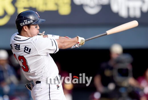 [마이데일리 = 유진형 기자] 두산 허경민이 25일 오후 서울 잠실야구장에서 진행된 '2018 신한은행 MY CAR KBO리그' 두산 베어스와 넥센 히어로즈의 경기 7회말 무사 1루 안타를 치고 있다.