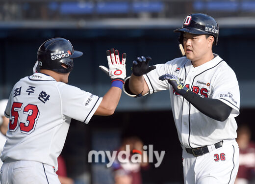 [마이데일리 = 유진형 기자] 두산 오재일이 25일 오후 서울 잠실야구장에서 진행된 '2018 신한은행 MY CAR KBO리그' 두산 베어스와 넥센 히어로즈의 경기 7회말 2사 만루 만루홈런을 친 뒤 동료들의 축하를 받고 있다.