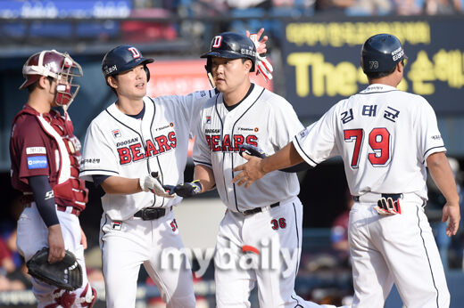 [마이데일리 = 유진형 기자] 두산 오재일이 25일 오후 서울 잠실야구장에서 진행된 '2018 신한은행 MY CAR KBO리그' 두산 베어스와 넥센 히어로즈의 경기 7회말 2사 만루 만루홈런을 친 뒤 동료들의 축하를 받고 있다.