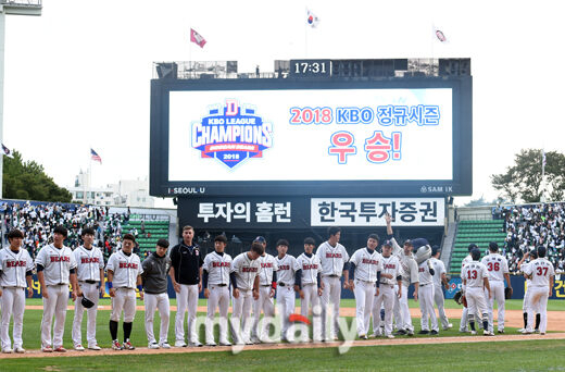 [마이데일리 = 유진형 기자] 두산이 25일 오후 서울 잠실야구장에서 진행된 '2018 신한은행 MY CAR KBO리그' 두산 베어스와 넥센 히어로즈의 경기에서 13-2로 승리하며 정규시즌 우승을 차지한 뒤 기뻐하고 있다.