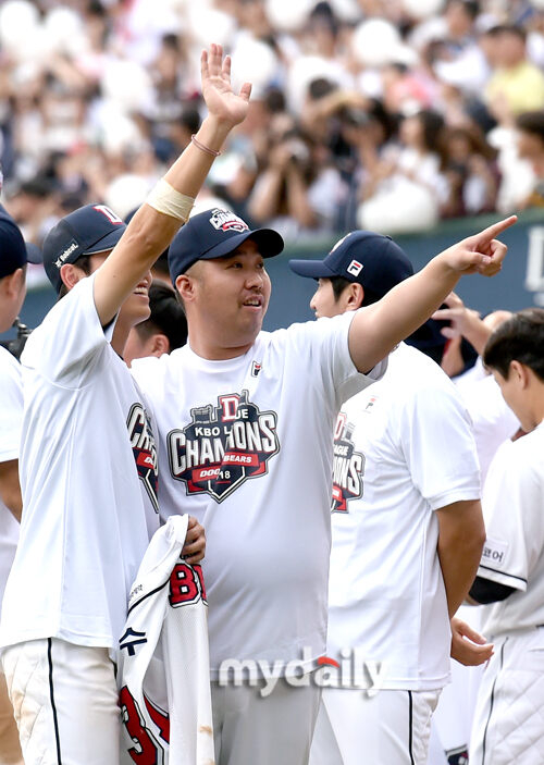 [마이데일리 = 유진형 기자] 두산 유희관이 25일 오후 서울 잠실야구장에서 진행된 '2018 신한은행 MY CAR KBO리그' 두산 베어스와 넥센 히어로즈의 경기에서 13-2로 승리하며 정규시즌 우승을 차지한 뒤 기뻐하고 있다.