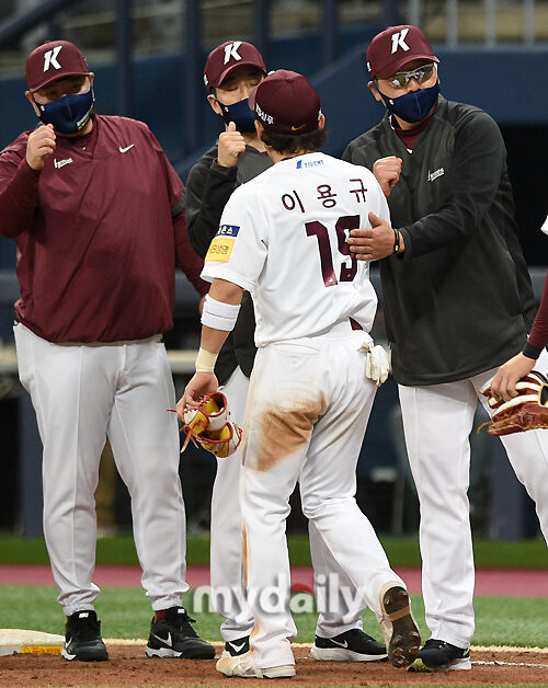 [마이데일리 = 유진형 기자] 키움이 3일 오후 서울 고척스카이돔에서 진행된 '2021 신한은행 SOL KBO리그' 개막전, 키움 히어로즈와 삼성 라이온즈의 경기에서 6-1로 승리한 뒤 기뻐하고 있다.