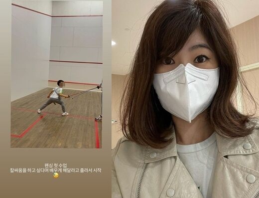강수정은 14일 자신의 인스타그램 스토리에 "펜싱 첫 수업. 칼싸움하고 싶다며 배우게 해달라고 졸라서 시작"이라는 글과 함께 한 장의 사진을 게재했다.