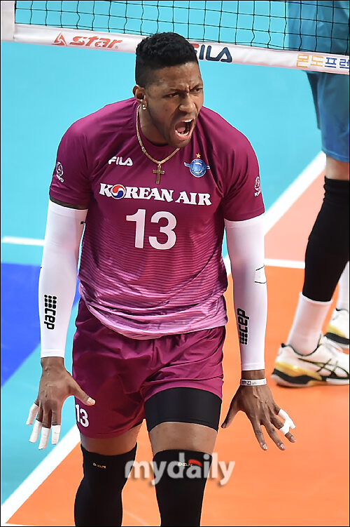 [마이데일리 = 송일섭 기자] 대한항공 요스바니가 14일 오후 서울 장충체육관에서 진행된 '2020-2021 프로배구 V리그 남자부 챔피언결정전 3차전' 우리카드 vs 대한항공의 경기에서 득점에 포효하고 있다.