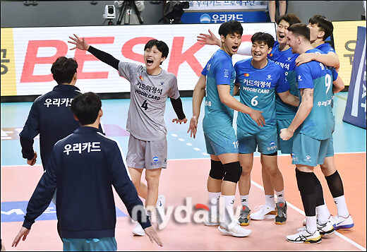 [마이데일리 = 송일섭 기자] 우리카드 선수들이 14일 오후 서울 장충체육관에서 진행된 '2020-2021 프로배구 V리그 남자부 챔피언결정전 3차전' 우리카드 vs 대한항공의 경기에서 세트스코어 3-0으로 승리한 뒤 환호하고 있다.