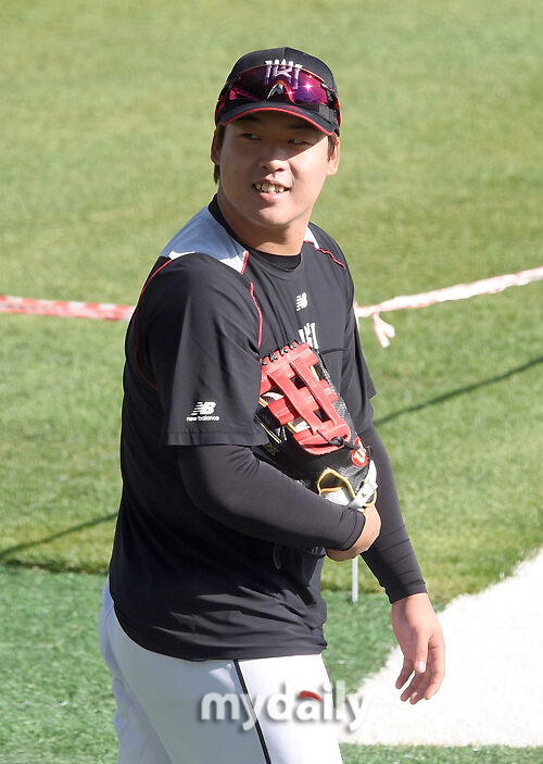 [마이데일리 = 유진형 기자] KT 강백호가 14일 오후 서울 고척스카이돔에서 진행된 '2021 신한은행 SOL KBO리그' 두산 베어스와 KT 위즈의 경기에 앞서 훈련을 준비하고 있다.
