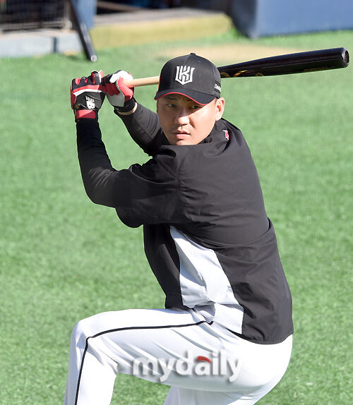 [마이데일리 = 유진형 기자] KT 장성우가 14일 오후 서울 고척스카이돔에서 진행된 '2021 신한은행 SOL KBO리그' 두산 베어스와 KT 위즈의 경기에 앞서 훈련하고 있다.