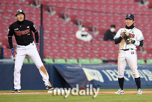 [마이데일리 = 유진형 기자] 두산 3루수 허경민이 14일 오후 서울 잠실야구장에서 진행된 '2021 신한은행 SOL KBO리그' 두산 베어스와 KT 위즈의 경기 2회초 2사 1루서 KT 조용호의 중전안타때 1루주자 유한준을 3루에서 태그아웃을 시도했지만 간발의 차로 세이프가 선언되자 아쉬워하고 있다.