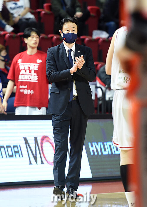 [마이데일리 = 인천 김성진 기자] 오리온 강을준 감독이 14일 오후 인천 삼산월드체육관에서 진행된 '2020-2021 현대모비스 프로농구' 6강 플레이오프 3차전 인천 전자랜드와 고양 오리온의 경기에서 선수들에게 박수를 보내고 있다.