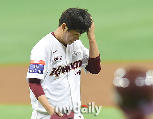 [마이데일리 = 한혁승 기자] 키움 선발 김정인이 14일 오후 서울 고척동 스카이돔에서 열린 2021 KBO리그 LG-키움 경기 1회초 수비를 마치고 더그아웃으로 들어서고 있다.
