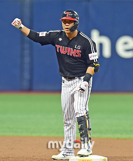 [마이데일리 = 한혁승 기자] LG 김민성이 14일 오후 서울 고척동 스카이돔에서 열린 2021 KBO리그 LG-키움 경기 2회초 첫 타자로 나와 2루타를 쳤다.