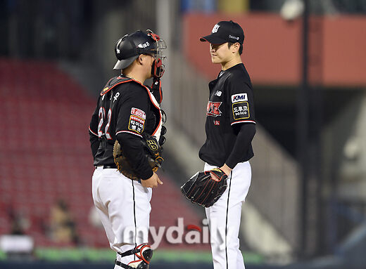 [마이데일리 = 유진형 기자] KT 선발투수 배제성이 14일 오후 서울 잠실야구장에서 진행된 '2021 신한은행 SOL KBO리그' 두산 베어스와 KT 위즈의 경기 2회말 1사 2루서 장성우 포수와 이야기를 나누고 있다.