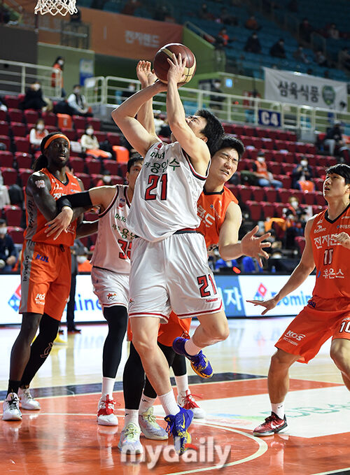 [마이데일리 = 인천 김성진 기자] 오리온 김강선이 14일 오후 인천 삼산월드체육관에서 진행된 '2020-2021 현대모비스 프로농구' 6강 플레이오프 3차전 인천 전자랜드와 고양 오리온의 경기에서 반칙을 유도하고 있다.