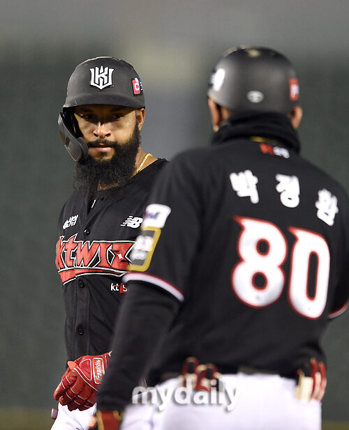 [마이데일리 = 유진형 기자] KT 알몬테가 14일 오후 서울 잠실야구장에서 진행된 '2021 신한은행 SOL KBO리그' 두산 베어스와 KT 위즈의 경기 4회초 무사 1루서 우전안타를 친 뒤 기뻐하고 있다.