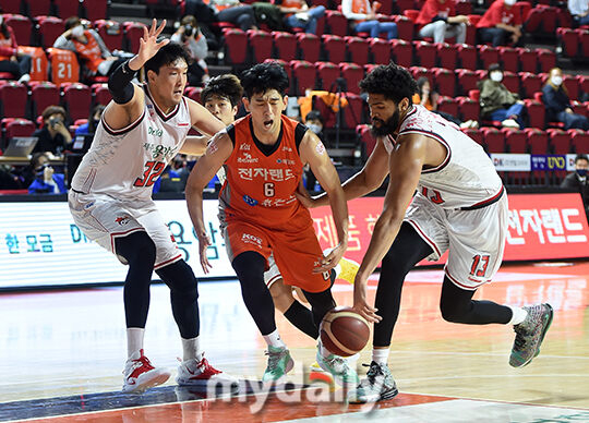 [마이데일리 = 인천 김성진 기자] 전자랜드 차바위가 14일 오후 인천 삼산월드체육관에서 진행된 '2020-2021 현대모비스 프로농구' 6강 플레이오프 3차전 인천 전자랜드와 고양 오리온의 경기에서 오리온 로슨에게 스틸을 당하고 있다.