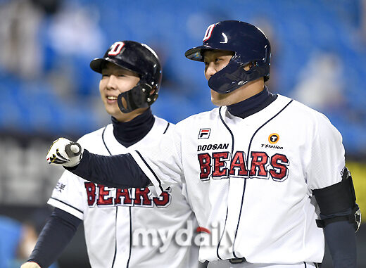 [마이데일리 = 유진형 기자] 두산 양석환이 14일 오후 서울 잠실야구장에서 진행된 '2021 신한은행 SOL KBO리그' 두산 베어스와 KT 위즈의 경기 5회말 2사 만루서 2타점 적시타를 친 뒤 기뻐하고 있다.