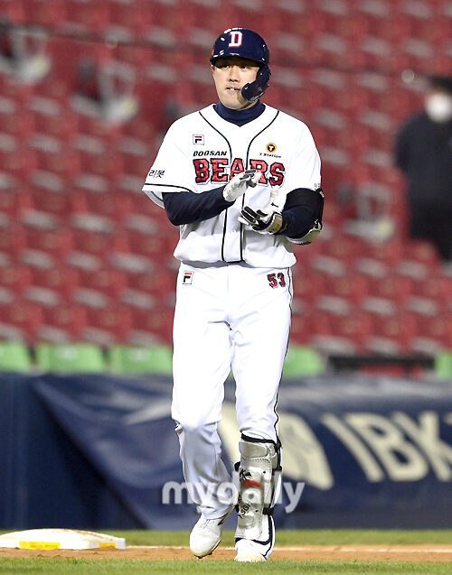 [마이데일리 = 유진형 기자] 두산 양석환이 14일 오후 서울 잠실야구장에서 진행된 '2021 신한은행 SOL KBO리그' 두산 베어스와 KT 위즈의 경기 5회말 2사 만루서 2타점 적시타를 친 뒤 기뻐하고 있다.