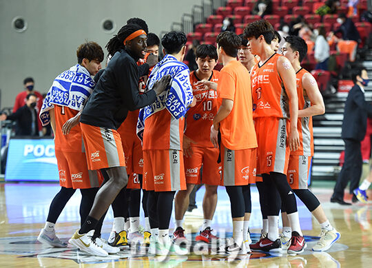 [마이데일리 = 인천 김성진 기자] 전자랜드 선수들이 14일 오후 인천 삼산월드체육관에서 진행된 '2020-2021 현대모비스 프로농구' 6강 플레이오프 3차전 인천 전자랜드와 고양 오리온의 경기에서 67-89로 패배한 후 아쉬워하고 있다.