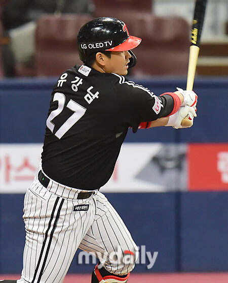 [마이데일리 = 한혁승 기자] LG 유강남이 14일 오후 서울 고척동 스카이돔에서 열린 2021 KBO리그 LG-키움 경기 7회초 1사 1-3루에 1타점 적시타를 쳤다.