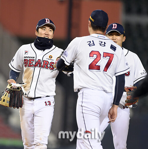 [마이데일리 = 유진형 기자] 두산 허경민이 14일 오후 서울 잠실야구장에서 진행된 '2021 신한은행 SOL KBO리그' 두산 베어스와 KT 위즈의 경기에서 3-1로 승리한 뒤 기뻐하고 있다.