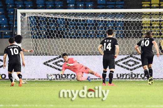 [마이데일리 = 성남 곽경훈 기자] 성남 김영광 골키퍼가 21일 오후 경기도 성남 탄천종합운동장에서 진행된 '하나원큐 K리그1 2021' 성남-인천의 경기 후반 김현의 PK를 막아내고 있다.