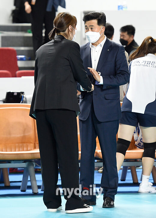하지만 김종민 감독은 김사니 감독대행쪽은 쳐다보지도 않은 채 코칭스태프들과 하이파이브를 하며 승리를 다짐했다. 세트 교체때도 김종민 감독은 모른 척하며 그냥 지나쳤고 경기가 끝난 뒤도 상대편을 쳐다보지 않았다.
