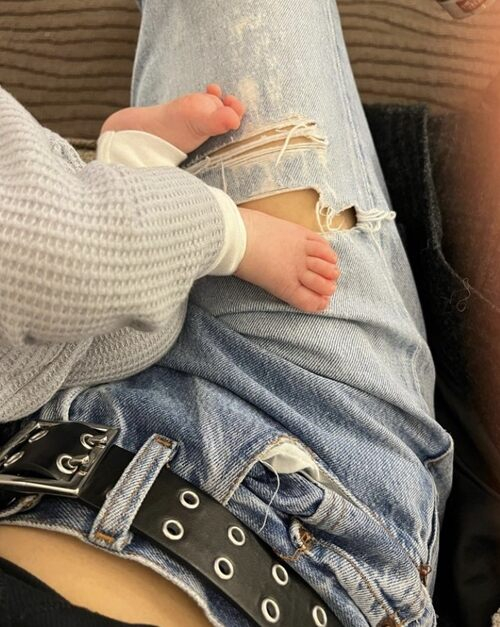 지난 1월 출산한 셋째 아이의 발가락이 프린슬루 무릎 위에 놓여 있는 모습도 볼 수 있다. 신생아는 스냅 사진에서 회색 잠옷을 입었고 프린슬루는 찢어진 청바지와 검은색 티를 선택했다.
