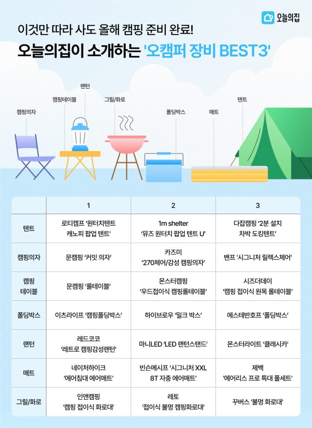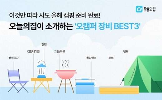 28일 라이프스타일 플랫폼 ‘오늘의집’이 4만6000개 유저 캠핑 사진·영상을 분석해 ‘오캠퍼 장비 베스트’를 공개했다. 캠핑 입문에 필요한 최소 장비로 꼽히는 캠핑 스타터팩 7종 △텐트 △캠핑 의자 △캠핑 테이블 △폴딩박스 △랜턴 △매트 △그릴의 베스트3 제품을 각각 선정해 소개한다.